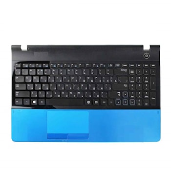 Клавиатура для ноутбука Samsung NP300E5A черная, верхняя панель в сборе (голубая)